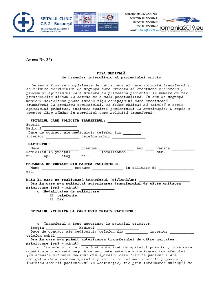 Fisa Medicala De Transfer Interclinic Al Pacientului Critic